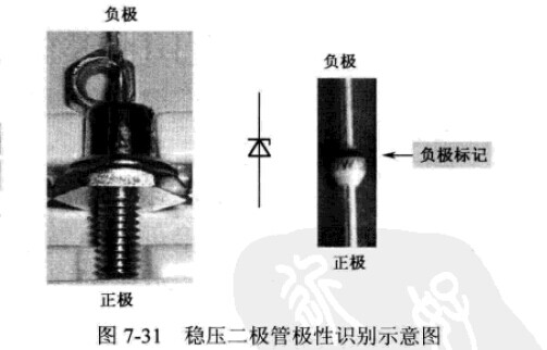 識別穩(wěn)壓二極管的各引腳有下列兩種方法:(1)通過穩(wěn)壓二極管外形特征和管殼上的各種標記,可以識別各種穩(wěn)壓二極管的正、負引肝鄧。例如,有的穩(wěn)壓二極管上直接標出圖形符號,塑料封閉的穩(wěn)壓二極管有標記的一端為負極,金屬封裝穩(wěn)壓二極管半圓面的一端為負極,平面的一端為正極,如圖7-31所示。(2)用萬用表來檢測的方法。穩(wěn)壓二極管也是一個PN結的結構,所以運用萬用表歐姆擋測量PN結的正向和反向電阻可以分辨正、負引腳。