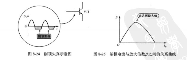 后級放大器的三極管靜態電流較大,這樣,三極管放大倍數B可以較大,放大能力較強,同時可以防止輸入信號進入三極管截止區,因為后級放大器的信號幅度已經較大了,對于NPN型三極管而言,其輸入信號負半周峰值部分將會進入三極管截止區,產生削頂失真,如圖8-24所示。