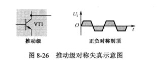 大信號的甲類放大器中,如果推動級放大管工作點在交流負載線中間,那么非線性失真會最小,如圖8-26所示。這是因為在正、負半周對稱削頂的情況下,信號的非線性失真小于非對稱(如大小頭失真,正半周削頂量大于負半周削頂量)時的非線性失真。