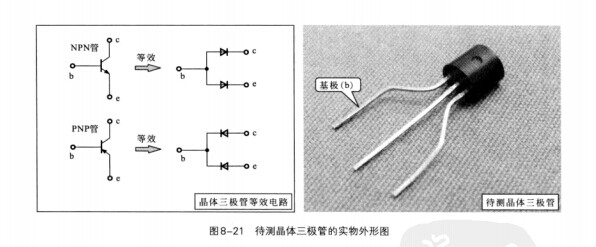 晶體三極管可以分為NPN型和PNP型兩種。在實際電路中,檢測判別待測的晶體三極管的類型時,可以將晶體三極管內(nèi)等效有兩個二極管,二極管具有單向?qū)щ娦裕萌f用表測量正向阻抗很低,而反向阻抗為無窮大。待測的晶體三極管,假設左邊的引腳為基極,根據(jù)集電極(c)與發(fā)射極(e)兩極間的正反向阻抗都很大的特點,通常大于幾百千歐,根據(jù)這個簡單的等效電路可判別出基極(b)。